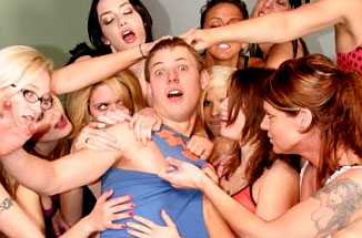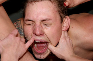 Pauly Harker gets ambushed by a band of crazy bitches who're raring to splash his face with globs of steamin' lady-juice. He gets his head totally soaked in the stuff and gets a taste of everyone's pussy to boot!